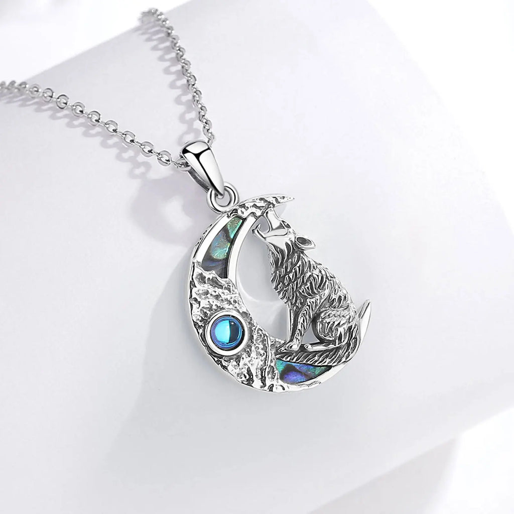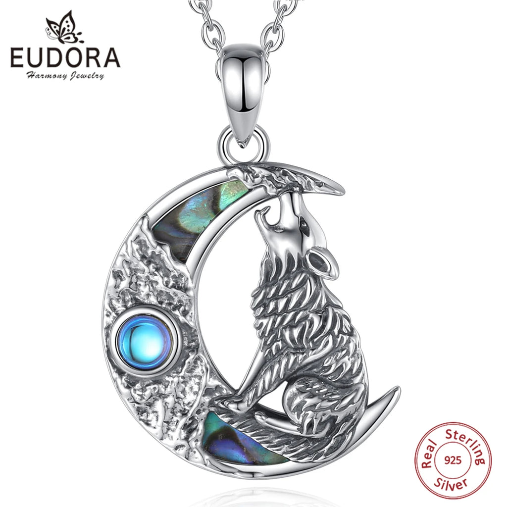 Eudora 925 Sterling Silver Wolf on the Moon Necklace for Women Man Natural Abalone Shell Viking Wolf Pendant Jewelry Party Gift