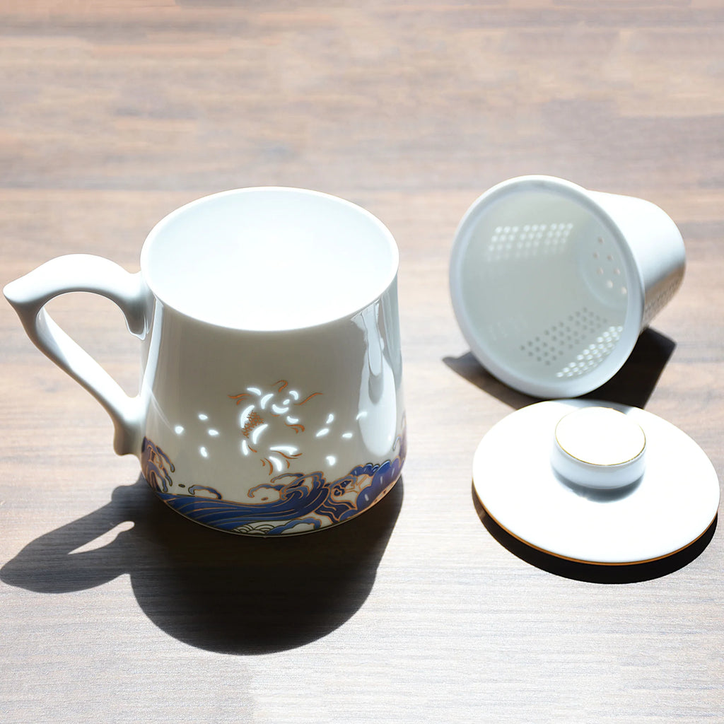 LIANHUA POTTERY Linglong Porcelain Mug with Tea Strainer Handcrafted Pierced Golden Koi and Blue Wave Cup Luxury Anniversar Gift