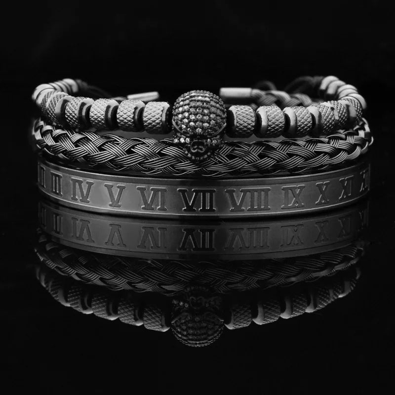 Luxury Black Stone Beads Leopard Head Man Bracelet Enamel Stainless Steel Roman Bangles Women Jewelry Set