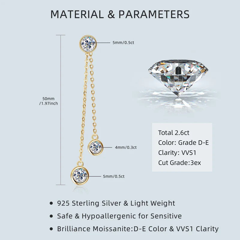 OXTAO Long Tassel Double Chain Earrings 925 Sterling Silver Round Cut Bezel Set D Color Moissanite Drop Earrings Jewelry Gift