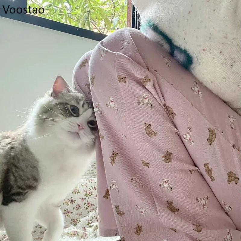 Pink Jeans Women Sweet Cute Cartoon Bear Print High Waist Wide Leg Pants Vintage Girls Casual Y2k Aesthetic Loose Denim Trousers