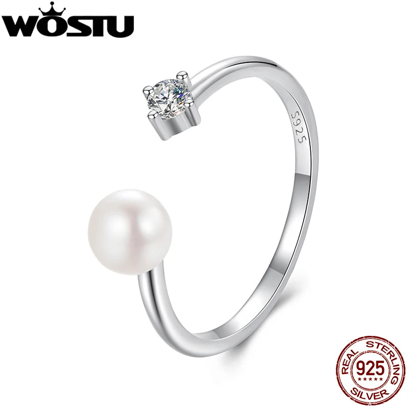 WOSTU Two Gems 0.1CT Moissanite 6mm Pearl Opening Ring Women s925 Silver Diamond Cut Wedding Party Rings Engagement Jewelry Gift