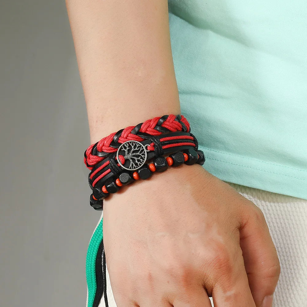 3Pcs/ Set Braided Wrap Leather Bracelets for Men Vintage Life Tree Rudder Charm Wood Beads Ethnic Tribal Wristband Rope Bracelet