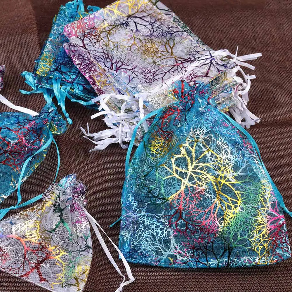 50pcs 7x9 9x12cm Organza Gift Bag Jewelry Packaging Drawstring Bag White Blue Colorful Trees Printing Party Wedding Candy Bag