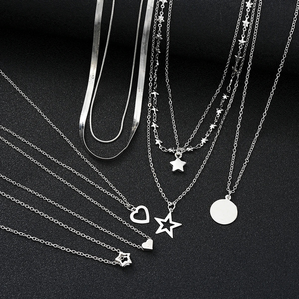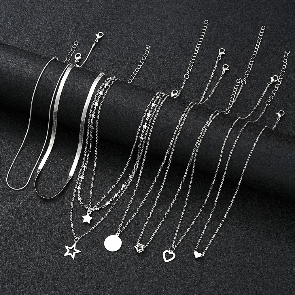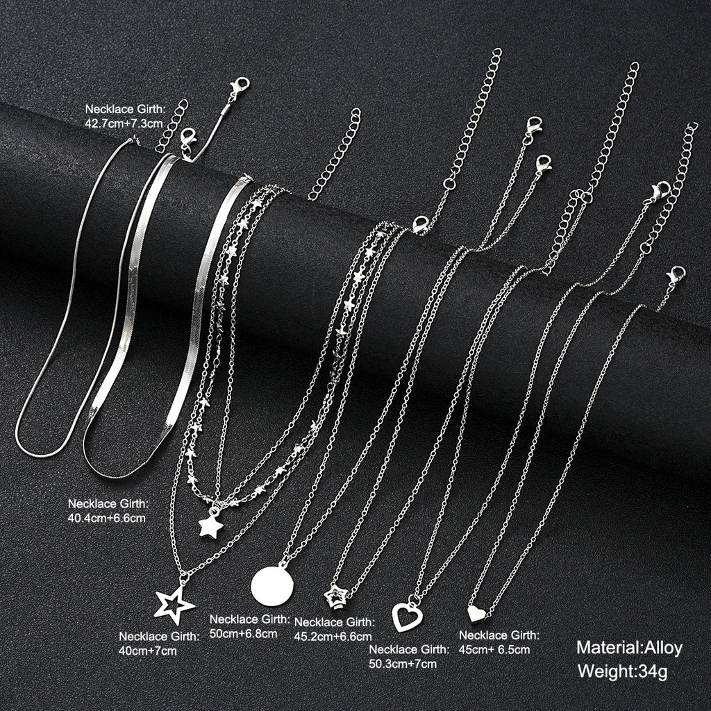 9 Pcs Simple Choker Necklaces for Women Fashion Love Heart Star Pendant Layered Necklace Jewelry Gift European and American 2024
