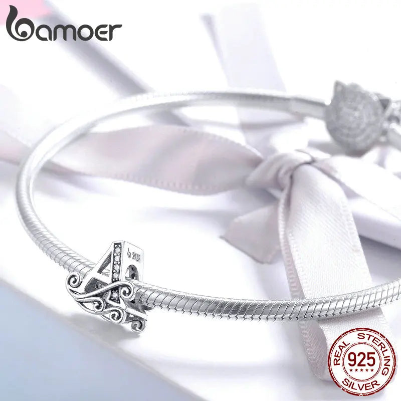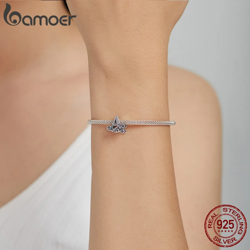 BAMOER Klassischer Buchstabe-Vintage-Charm aus 925er Sterlingsilber von A bis Z, 26 Buchstaben-Charms, durchbrochene CZ-Alphabet-Perlen, passend für Bettelarmbänder BSC030