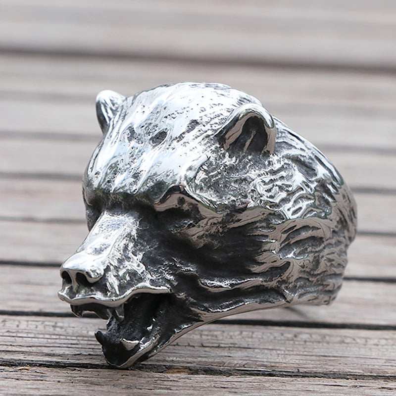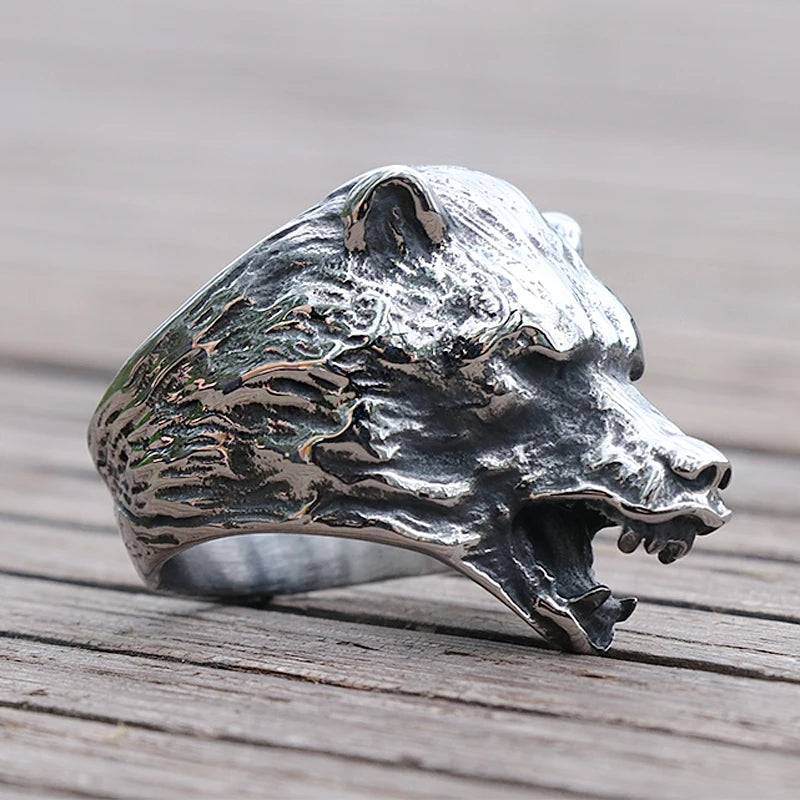 Cooler Wikinger-Bärenkopfring für Herren, slawischer Bär, Berserker, Edelstahl, Bikerringe, männlicher Punk-Tierring, nordischer Amulettschmuck
