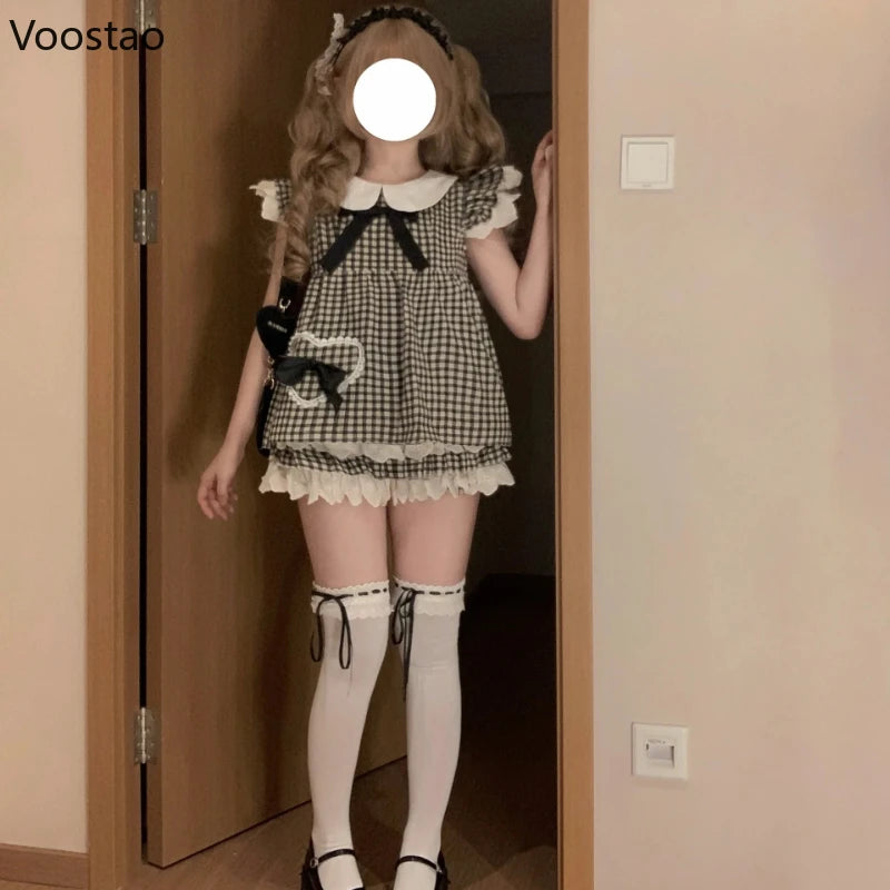 Kawaii Lolita Style Süßes 2-teiliges Set für Damen: Niedliche Bluse mit Peter-Pan-Kragen und Karomuster, Minirock im Y2K-Stil, koreanischer Modestil
