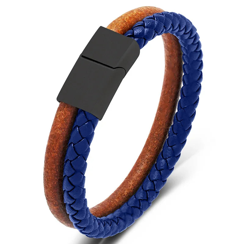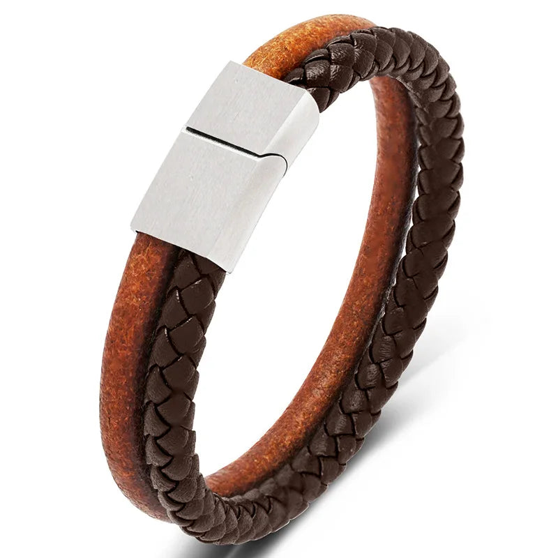 MKENDN Doppelsträngiges Original-Rindslederarmband mit gewebtem Leder, Edelstahl-Magnetschnalle, Zubehör, handgefertigte Geschenke