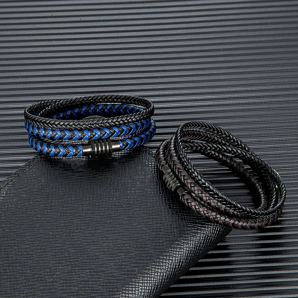 MKENDN Modische geflochtene Lederarmbänder für Herren, Punk-Stil, Edelstahl-Armreif, Schmuckgeschenk für Freunde