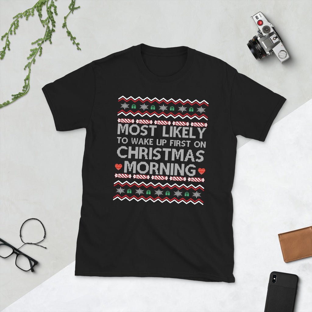 Am wahrscheinlichsten Shirts Weihnachten, Am wahrscheinlichsten wacht man am Weihnachtsmorgen zuerst auf, Passendes Familienshirt, Groovy Weihnachtsgeschenke Shirt