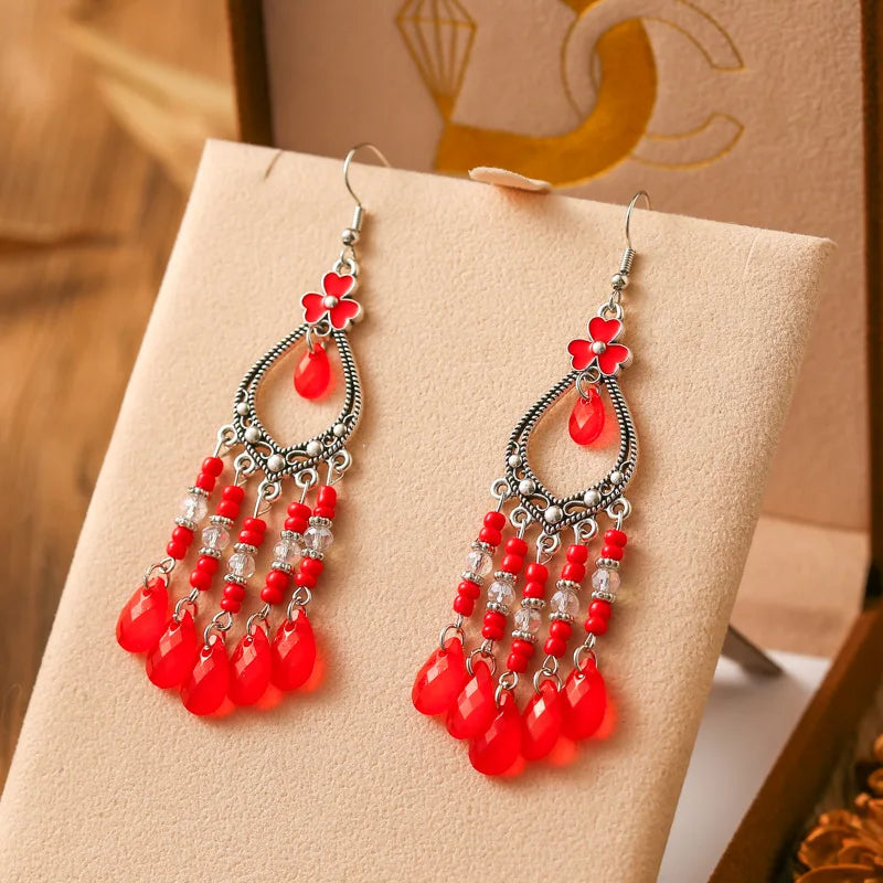 Neue böhmische Ohrringe mit langen Reisperlen in Tropfenform für Damen, ethnisch-retro, tropfenförmig, hohl, baumelnd, Schmuck für Urlaub und Party