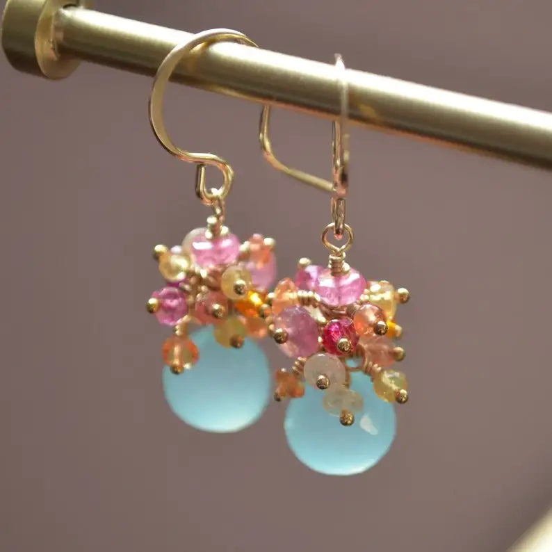 Summer Earrings, Gold Filled Jewelry, Real Chalcedony, Aqua Gemstones, Orange Yellow Pink Sapphires, Cluster Ear Rings