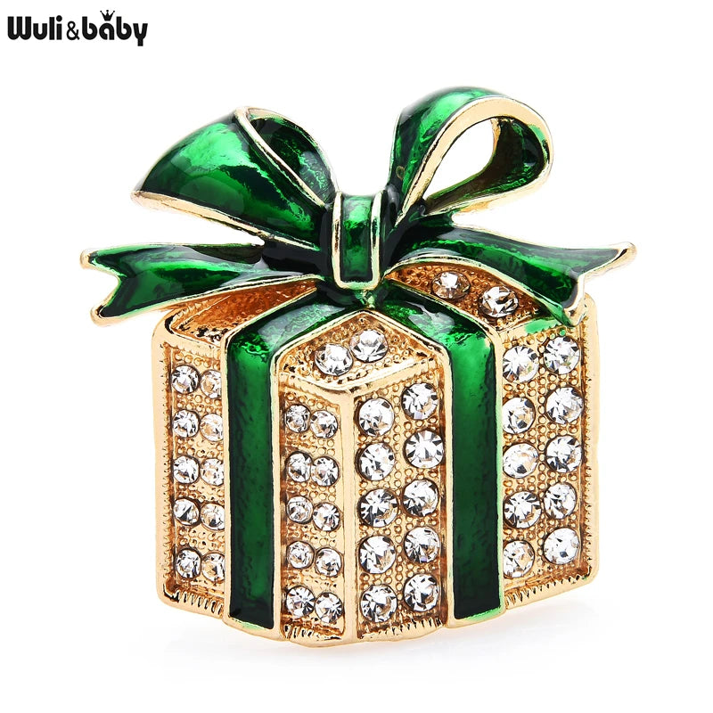 Wuli & baby Strass Emaille Geschenk Box Broschen Für Frauen Männer Rot Grün Bowknot Box Casual Party Brosche Pin Geschenke