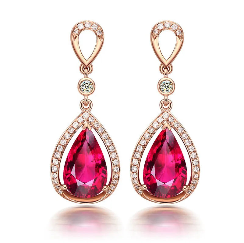 18k Rose Gold Jewelry with Ruby Red Gemstones Water Drop Shaped Earrings for Women Ruby Female Ear Drops Anniversary Cute Gifts
