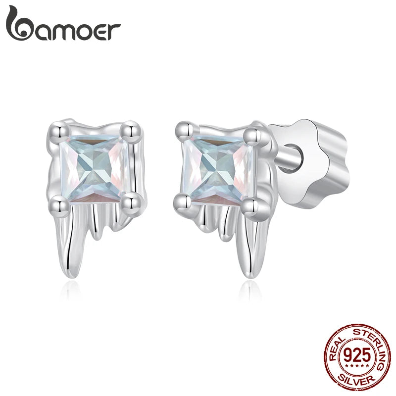 BAMOER 925 Sterling Silver Ice Cube Earrings, Sparkly Winter Ice CZ Christmas Stud Earrings Gifts for Women BSE1133