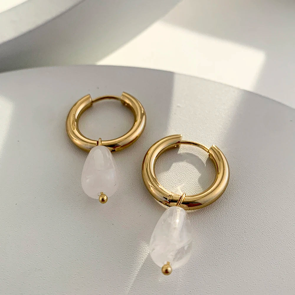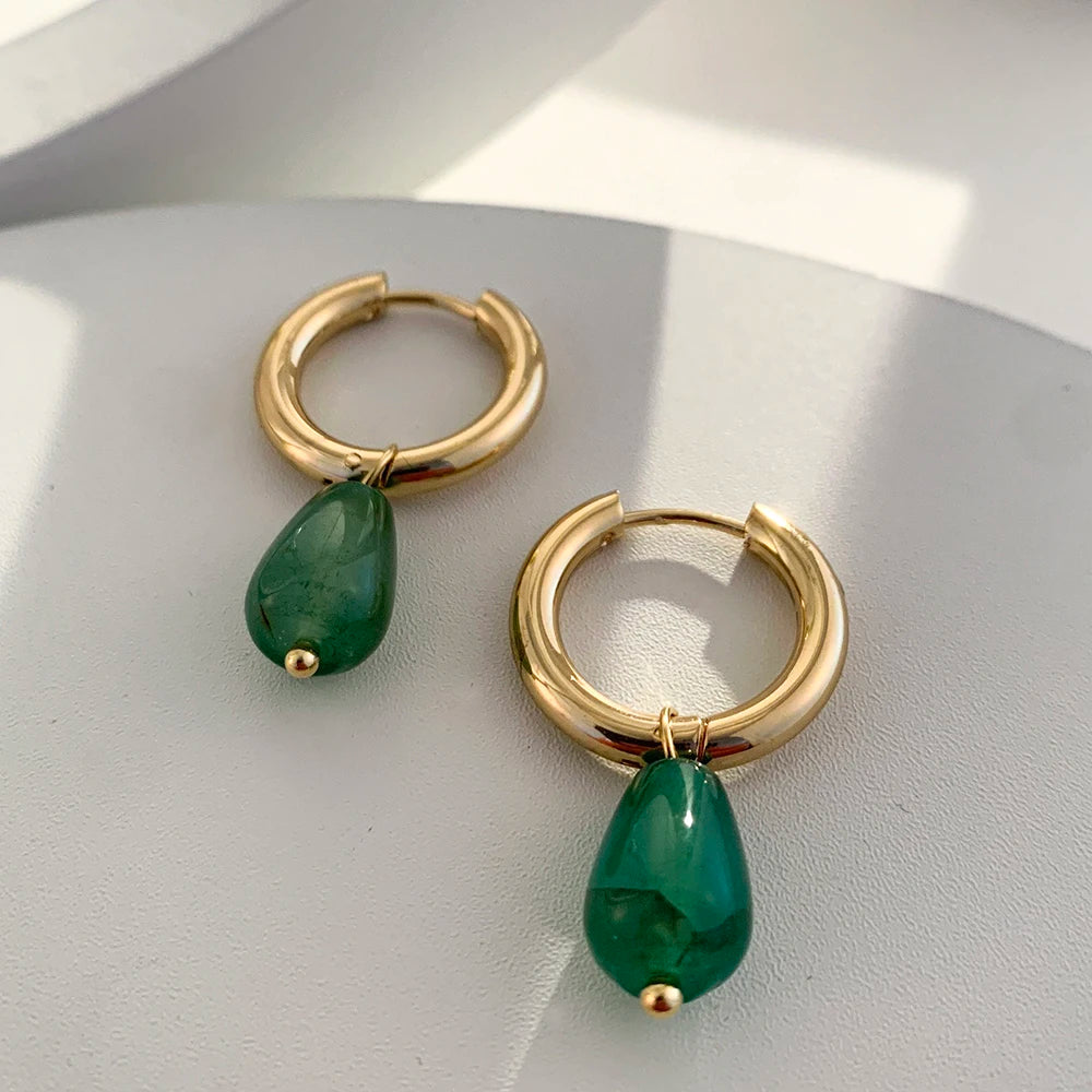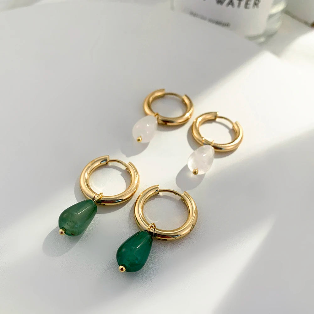 Golden plated Stainless Steel Circle Huggie Earring with Teardrop Green Natural Stone Hoop Earrings for Women Jewelry Wholesale
