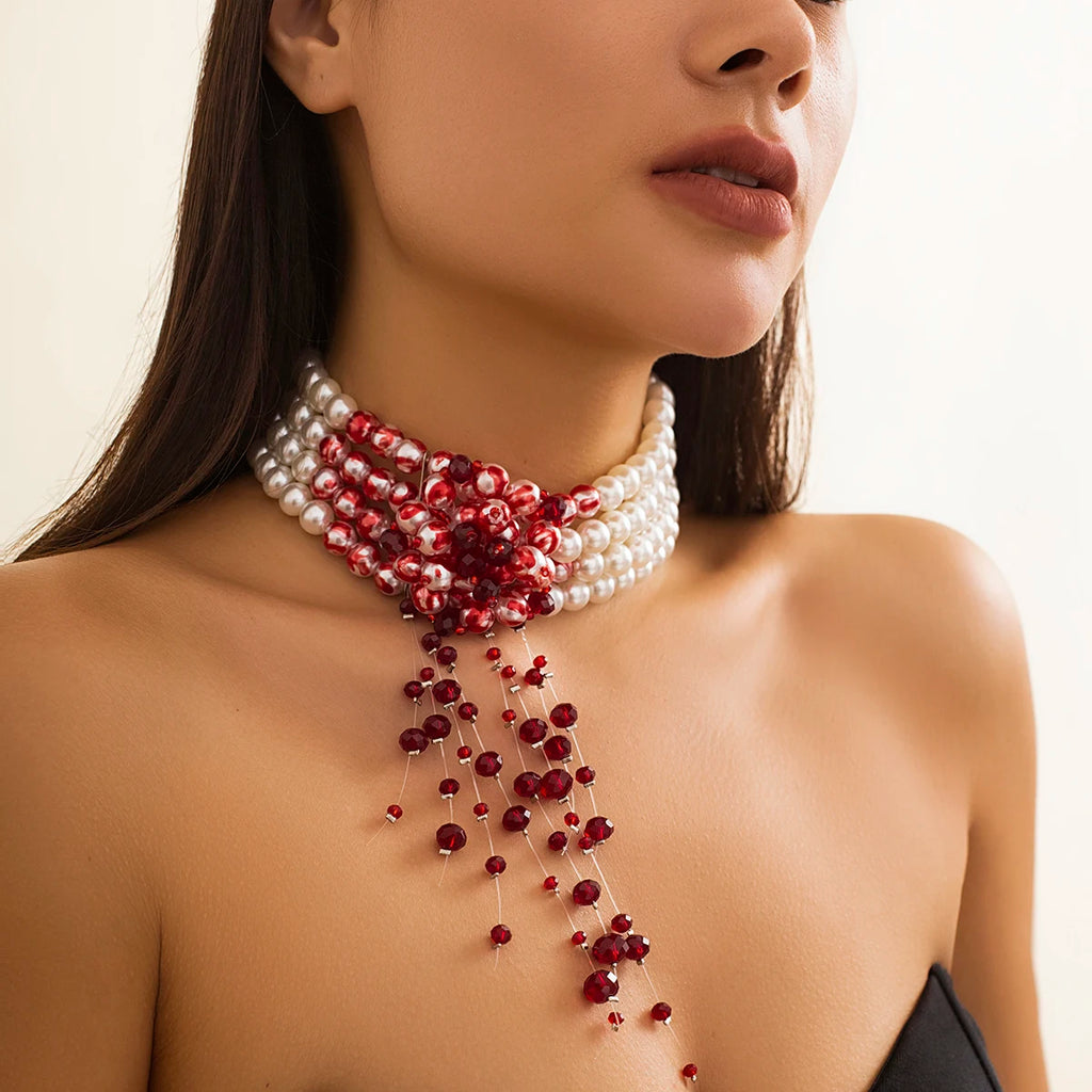 Goth Vintage Red Blood Pattern Imitation Pearl Chain Necklace for Women Wed Bridal Long Tassel Beads Pendant Halloween Jewelry