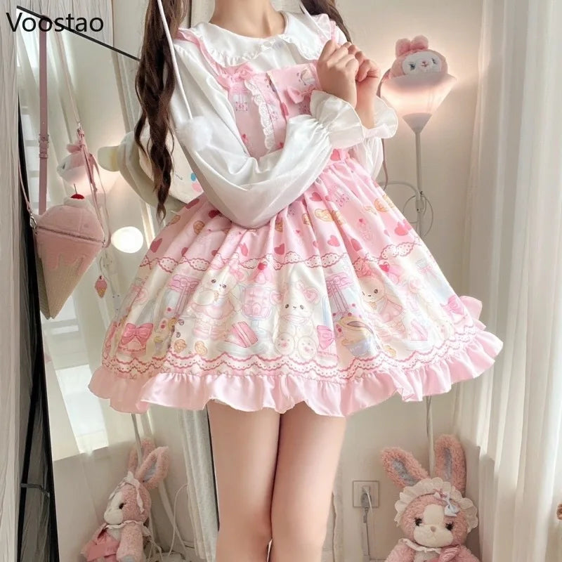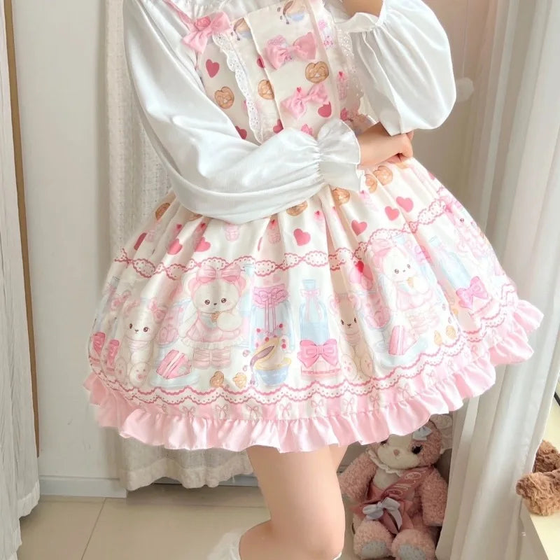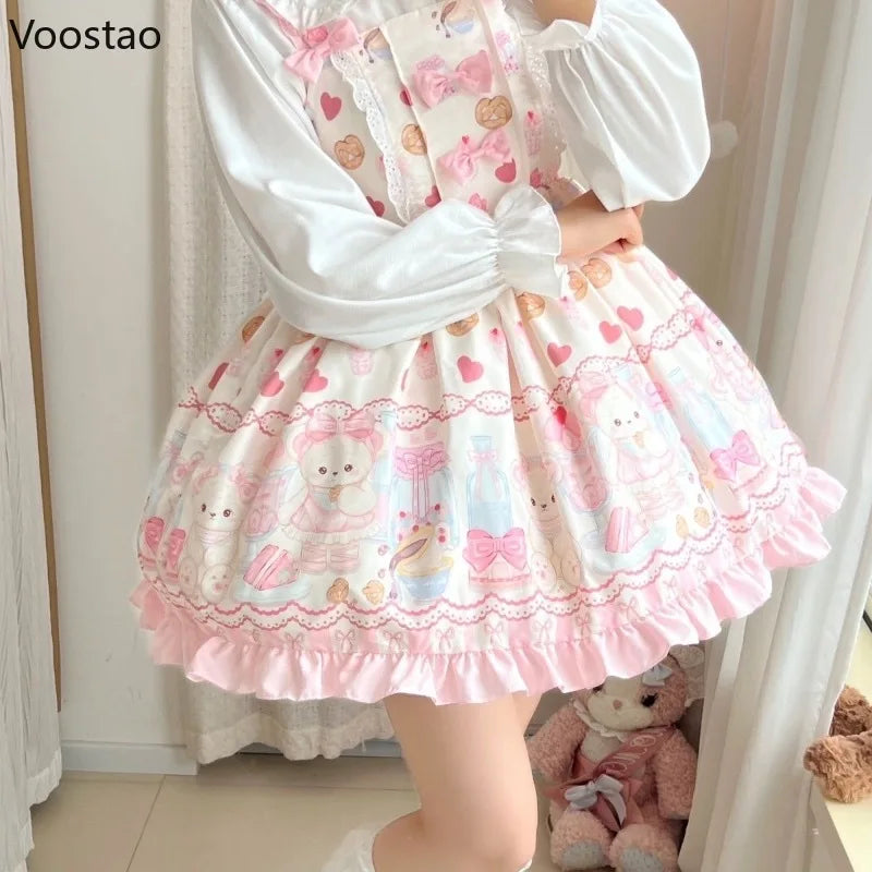 Japanese Sweet Lolita Jsk Dress Women Cute Cartoon Bear Print Bow Lace Ruffles Strap Dress Girls Kawaii Tea Party Princess Dress