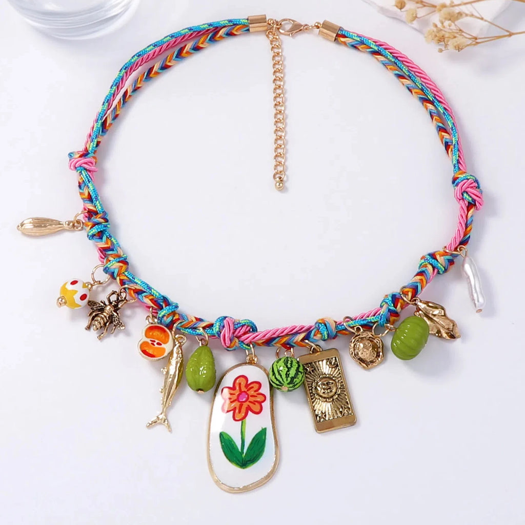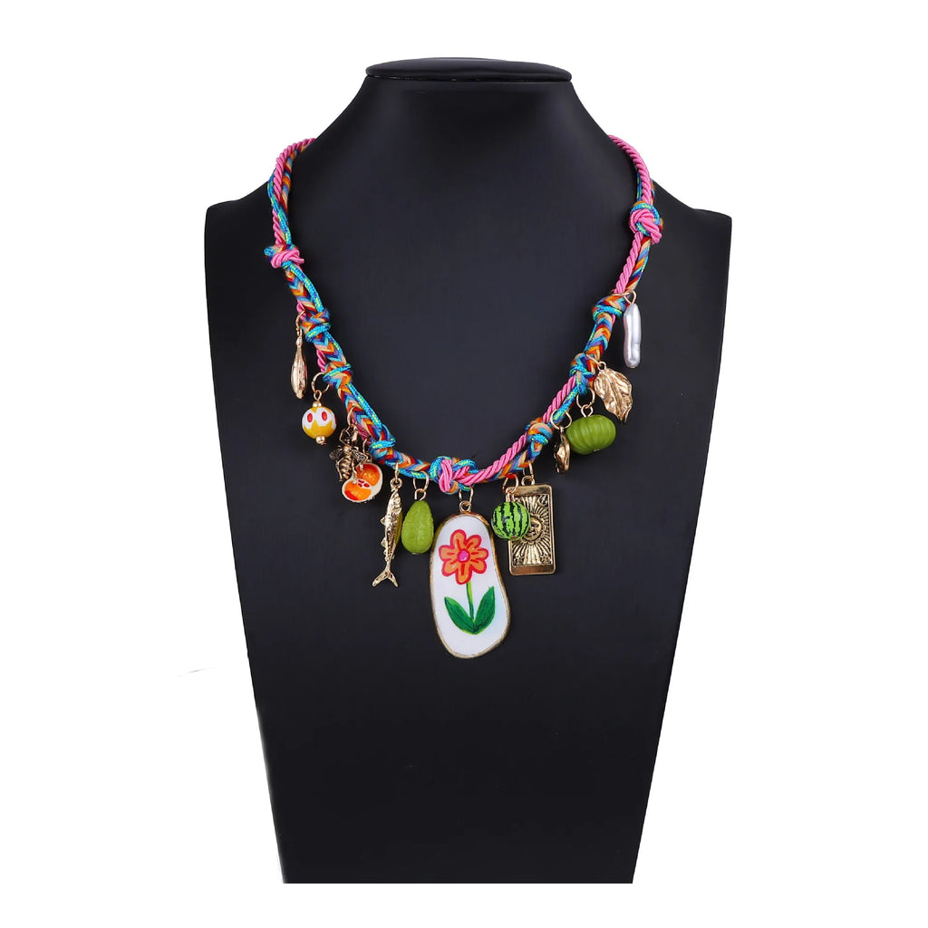 Summer Colored Hand Woven Rope Alloy Flower Fruit Pendant Necklace