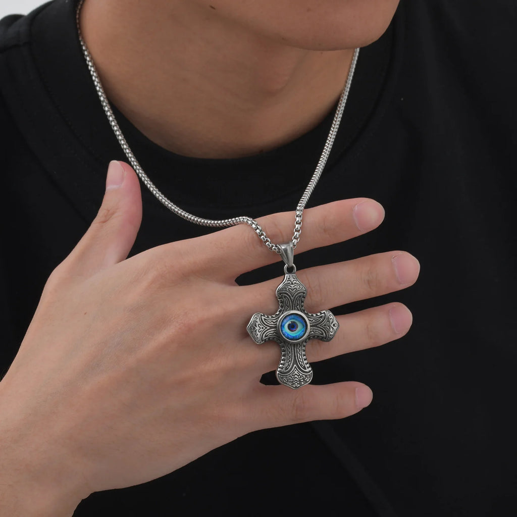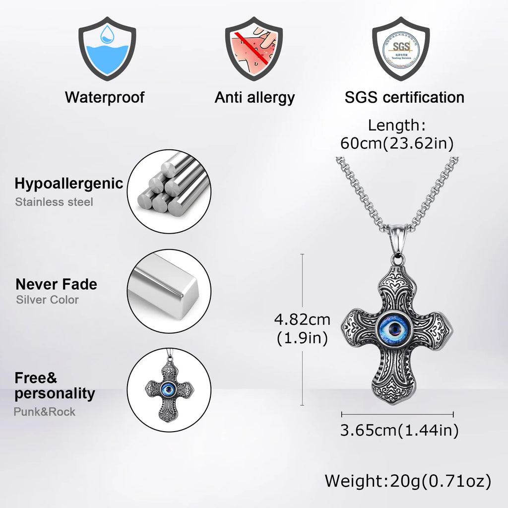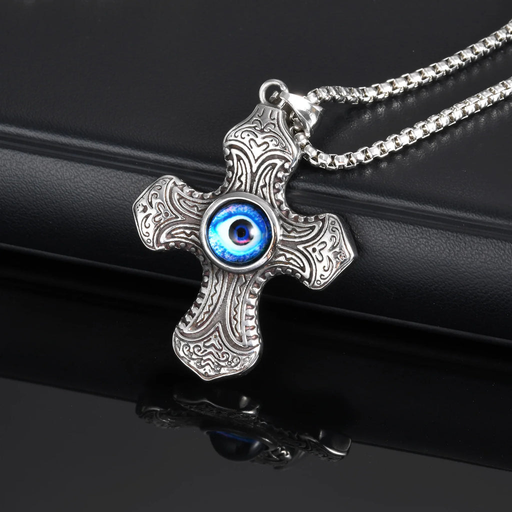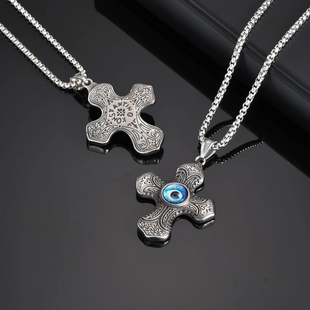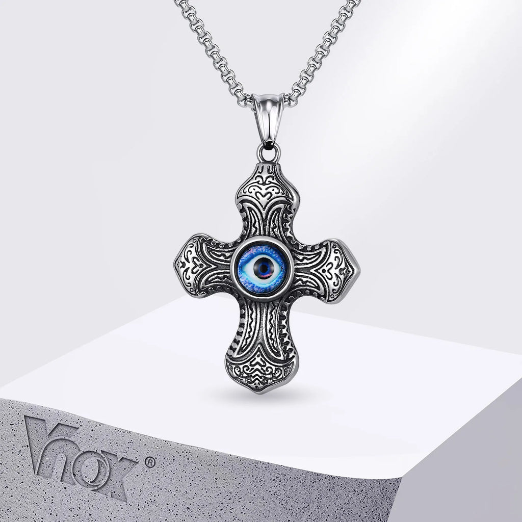 Vnox Vintage Turkish Evil Eye Centered Cross Necklaces for Men Boys, Punk Ethnic Tribal Textured Cross Pendant Collar