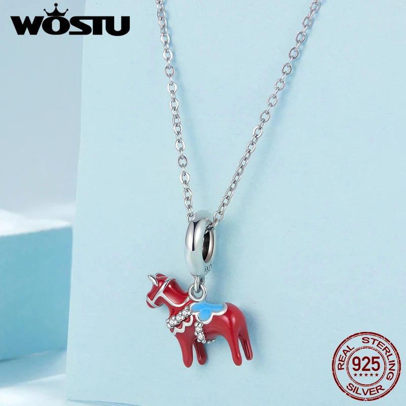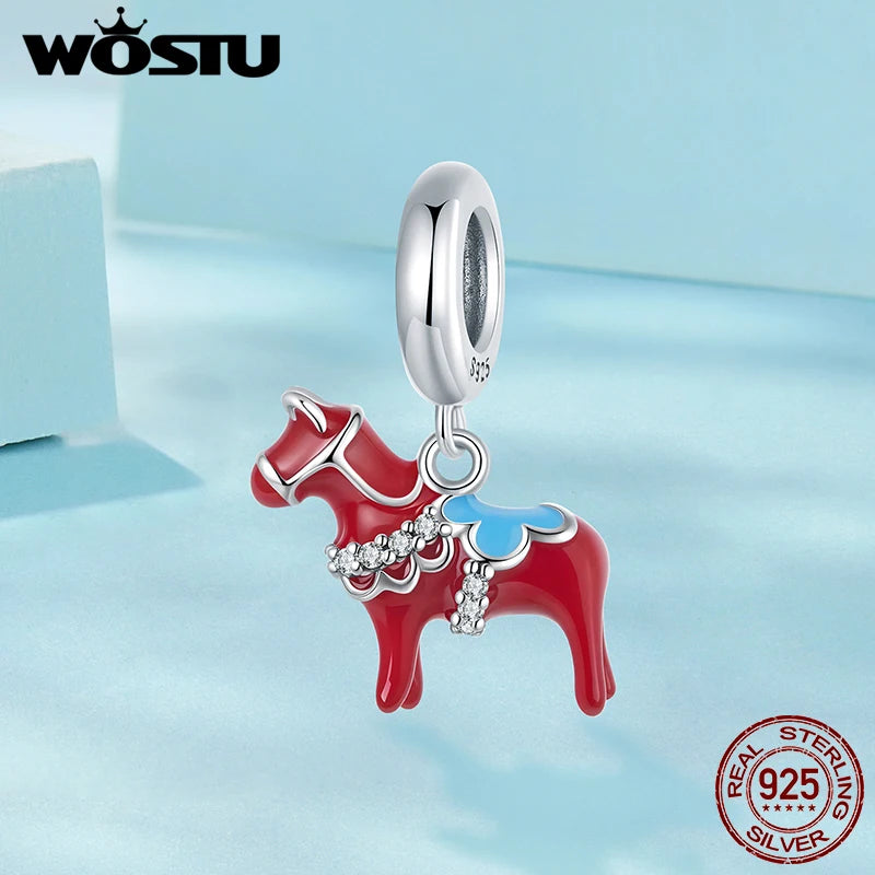 WOSTU 925 Sterling Silver Red Dalarna Horse Pendant Animal Charm Fit DIY Bracelet Necklace Women Family Daughter Jewelry Gift