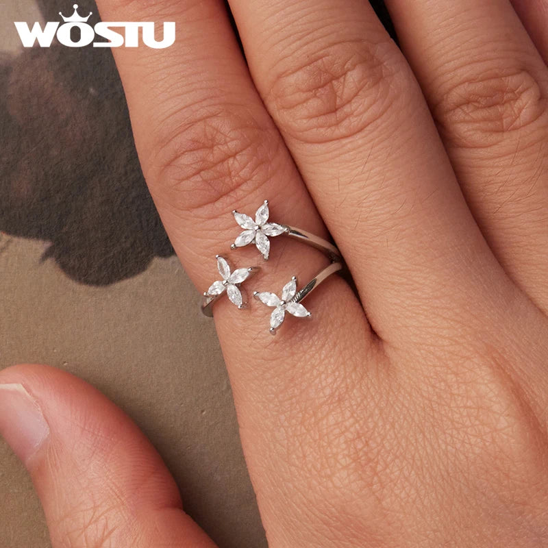 WOSTU 925 Sterling Silver Three Flower Open Ring For Women , Newest s925 Jewelry Gift Shiny AAA Zircon Stacking Leaf Rings R710