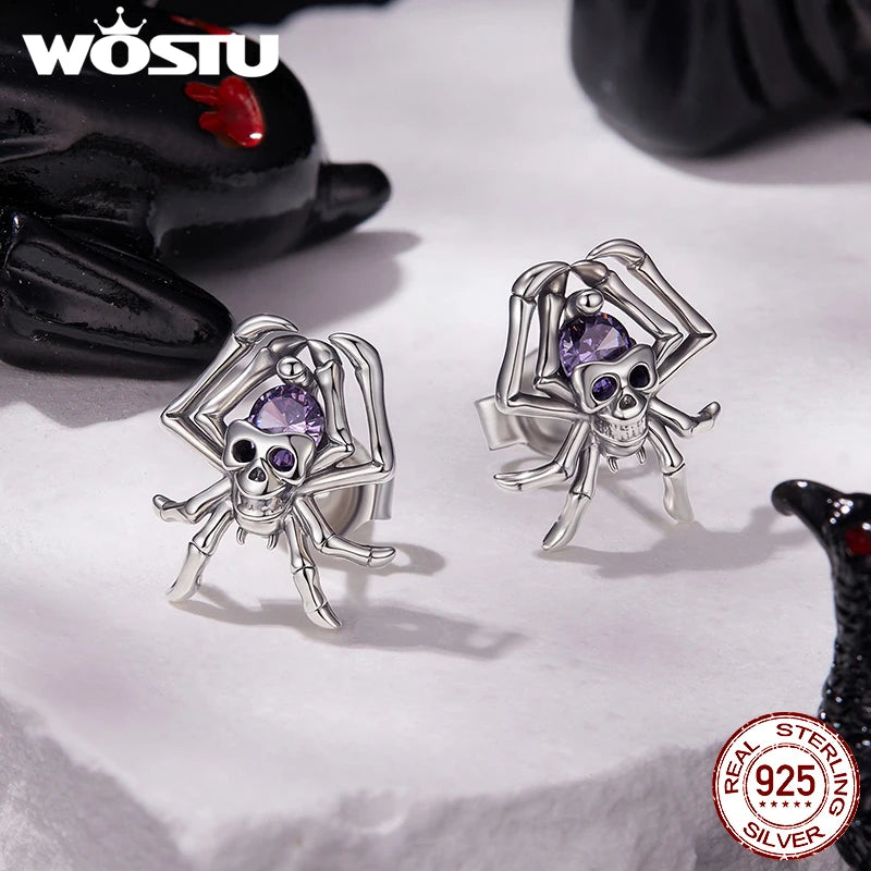 WOSTU 925 Sterling Silver Vintage Skull Stud Earrings For Women, Purple Rose Heart Zircon Punk Spider Ear Studs Halloween gift