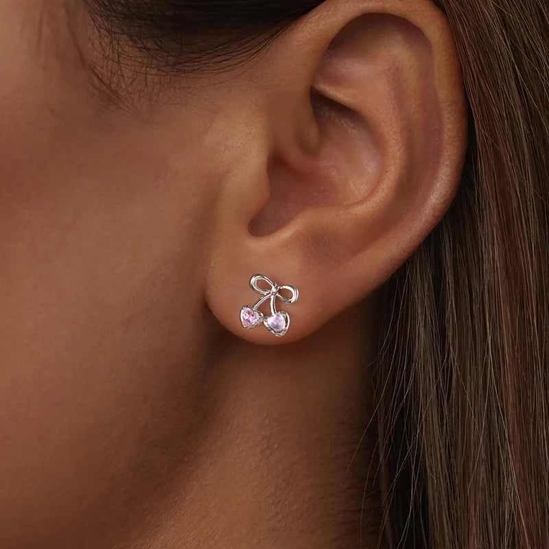 WOSTU Pink Cherry Bow Earrings For Women , Girl 925 Sterling Silver Stud Earrings Birthday Party Gift, Hypoallergenic Studs Xmas