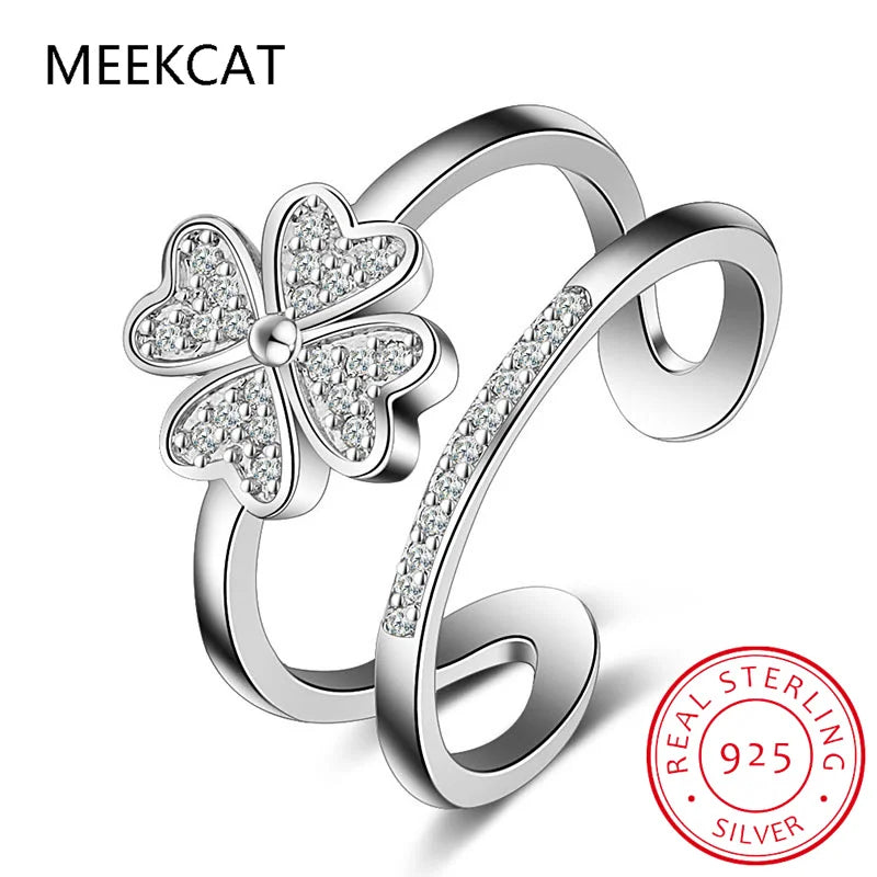 Bague en argent sterling 925 à double couche, ornée d'un cœur et d'un trèfle à quatre feuilles. Ajustable, sertie de zirconiums cubiques. Bijou de qualité supérieure BSR399