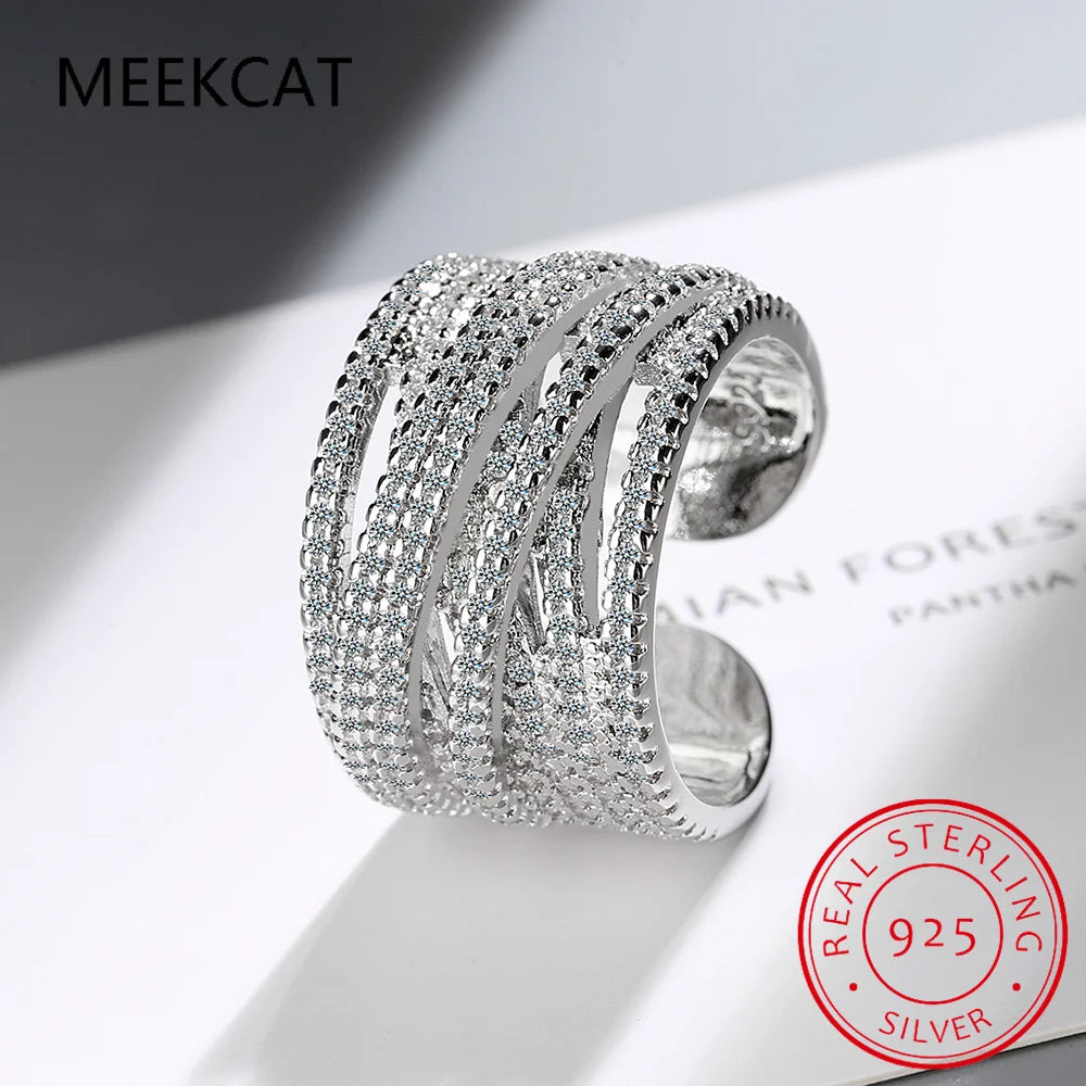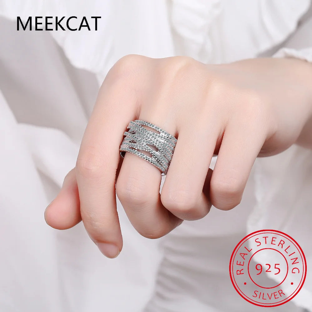 Bague en argent sterling 925 et moissnaïte pour femme, ornée d'une vague, sertie de diamants de laboratoire scintillants et de plusieurs couches. Bague large pour doigt.
