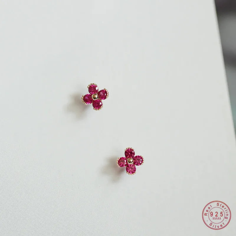 Boucles d'oreilles à tige en argent sterling 925 plaqué or 14 carats avec zircon rouge et jolies petites fleurs pour femme, bijoux de mariage, cadeau