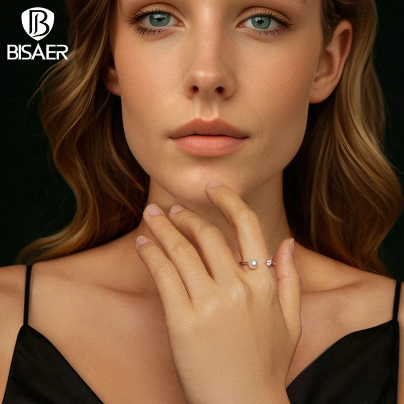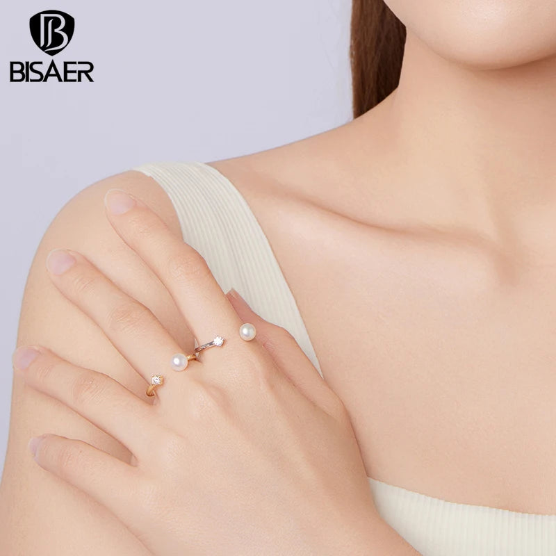 Bague ajustable BISAER en argent sterling 925 avec diamant de laboratoire taille moissanite de 0,1 carat, anneau ouvert et perle d'eau douce. Bijou fin pour femme.