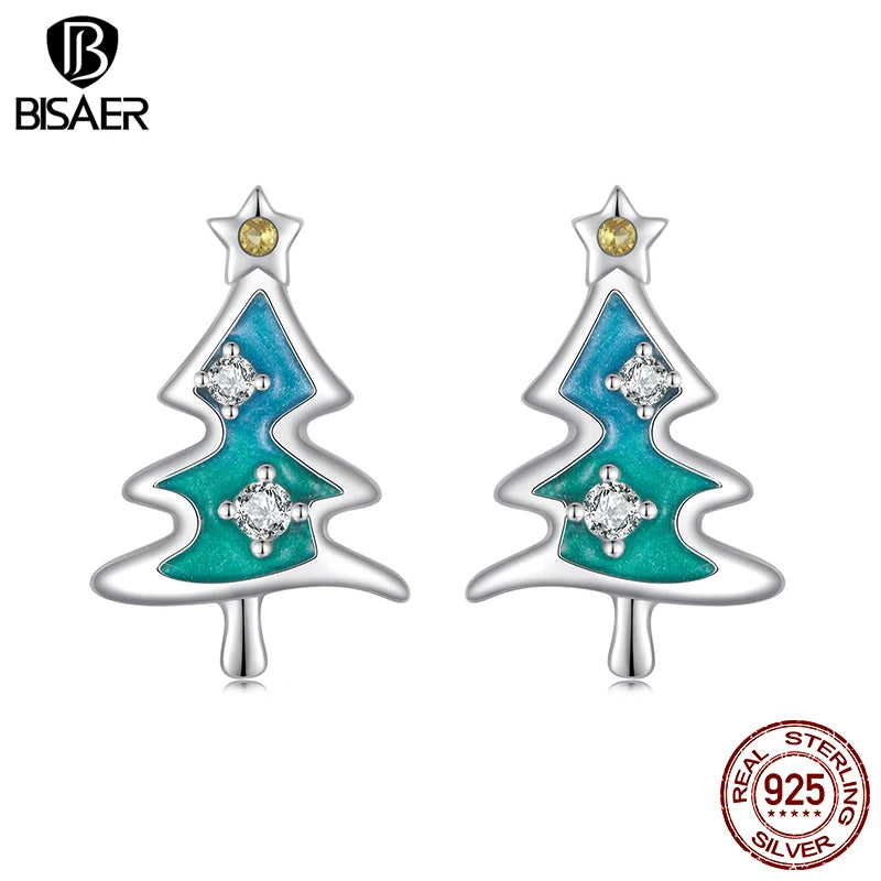 Boucles d'oreilles à tige en argent sterling 925 BISAER pour sapin de Noël, processus d'émail, hypoallergéniques, pour femmes, bijoux fins, cadeau de fête