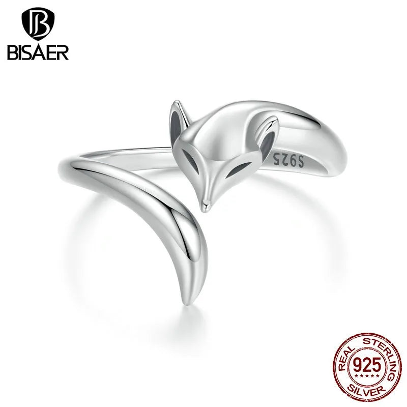 BISAER Bague ouverte en argent sterling 925 en forme de renard mignon avec animaux intelligents Taille réglable 5-9 pour femme Bijoux fins de fête ECR1066