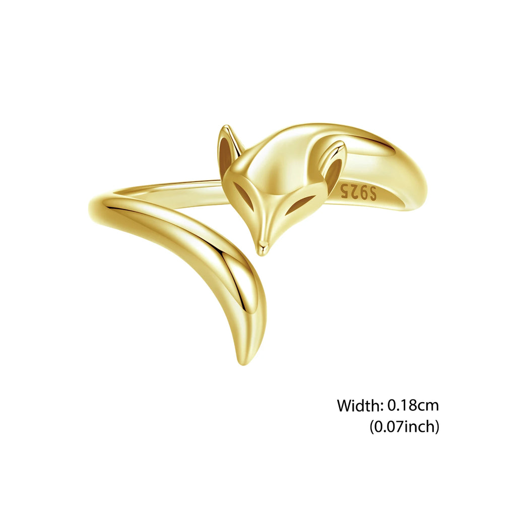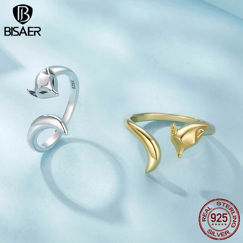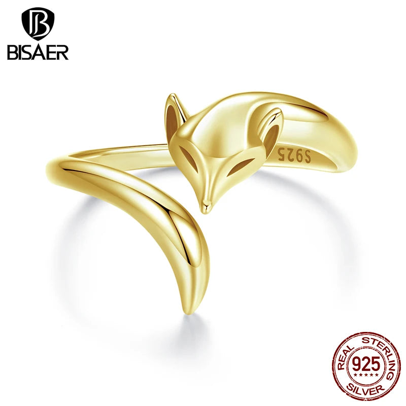 BISAER 925 Sterling Silver Cute Fox Open Ring Smart Animals Band Adjustable Size 5-9 Plated Gold for Women Party Fine Jewelry