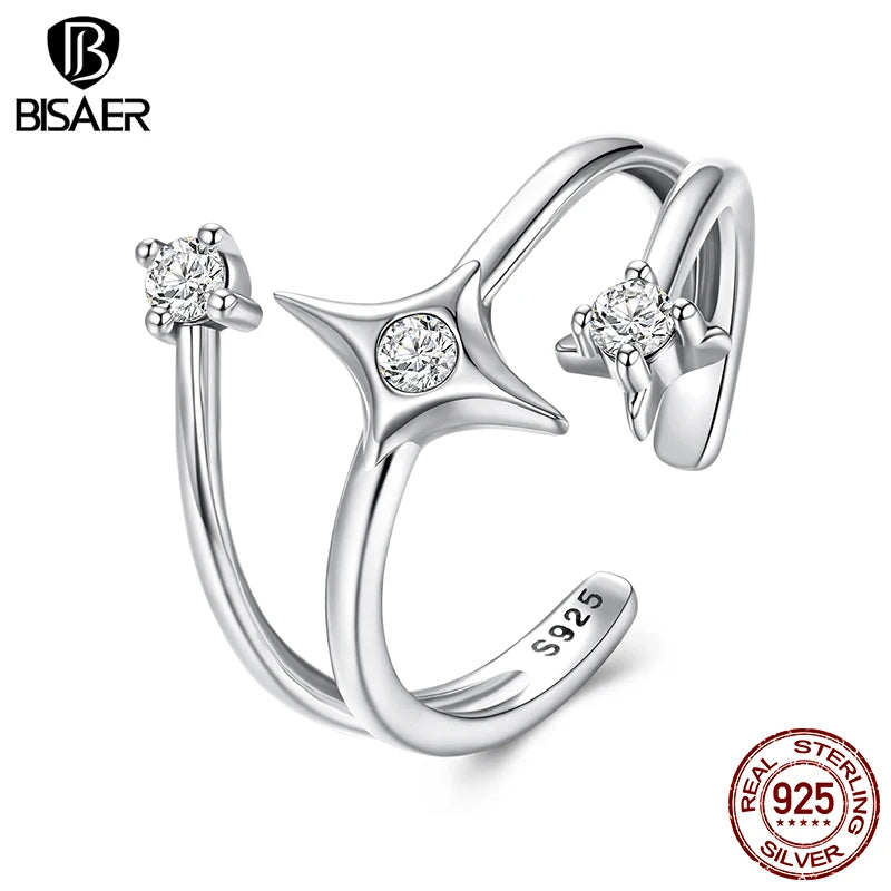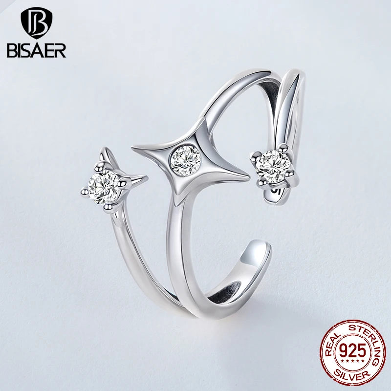 BISAER 925 Sterling Silver Multi-layered Starry Open Ring Sparkling Zircon Adjustable Size 5-9 Band for Women Party Fine Jewelry
