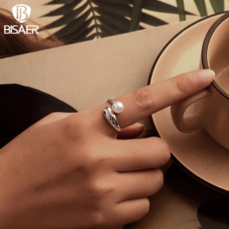 BISAER 925 Sterling Silver Pearl Open Ring Minimalist Metal Adjustable Band Plated White Gold for OL Women Party Fine Jewelry