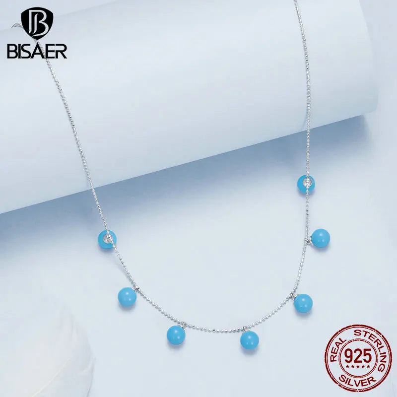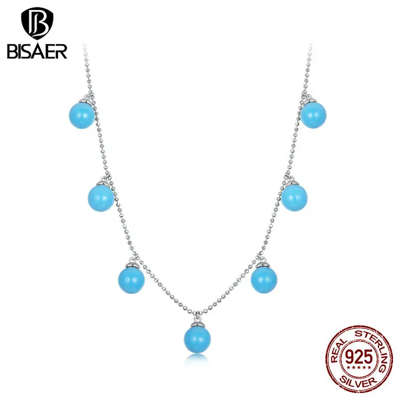 Collier pendentif rond en argent sterling 925 BISAER avec turquoise bleue et chaîne réglable plaquée or blanc pour femme, bijoux fins, cadeau