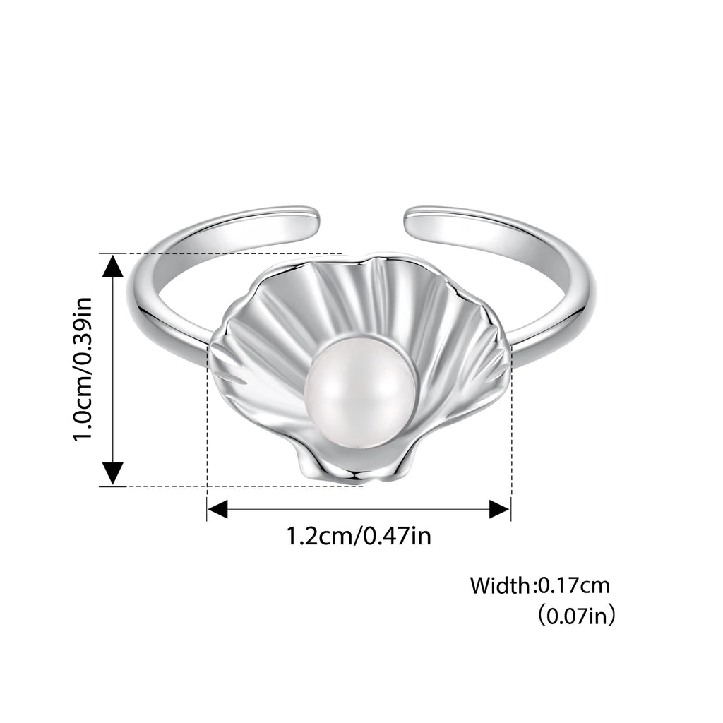 BISAER Bague ouverte en argent sterling 925 avec coquillage et perle, taille réglable 5 à 9, bande plaquée or blanc pour femme, bijoux fins de fête ECR1077