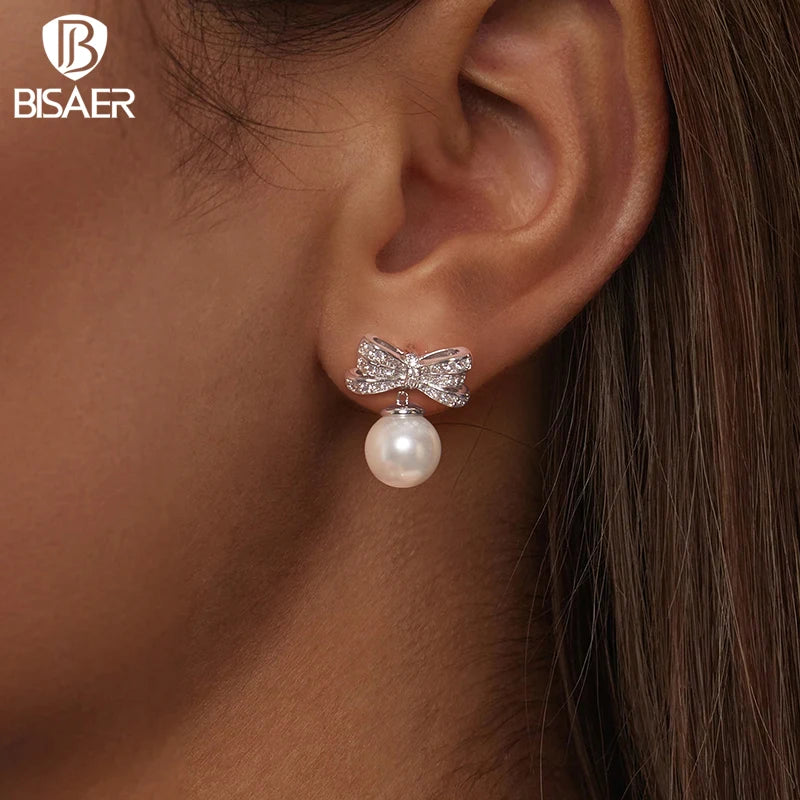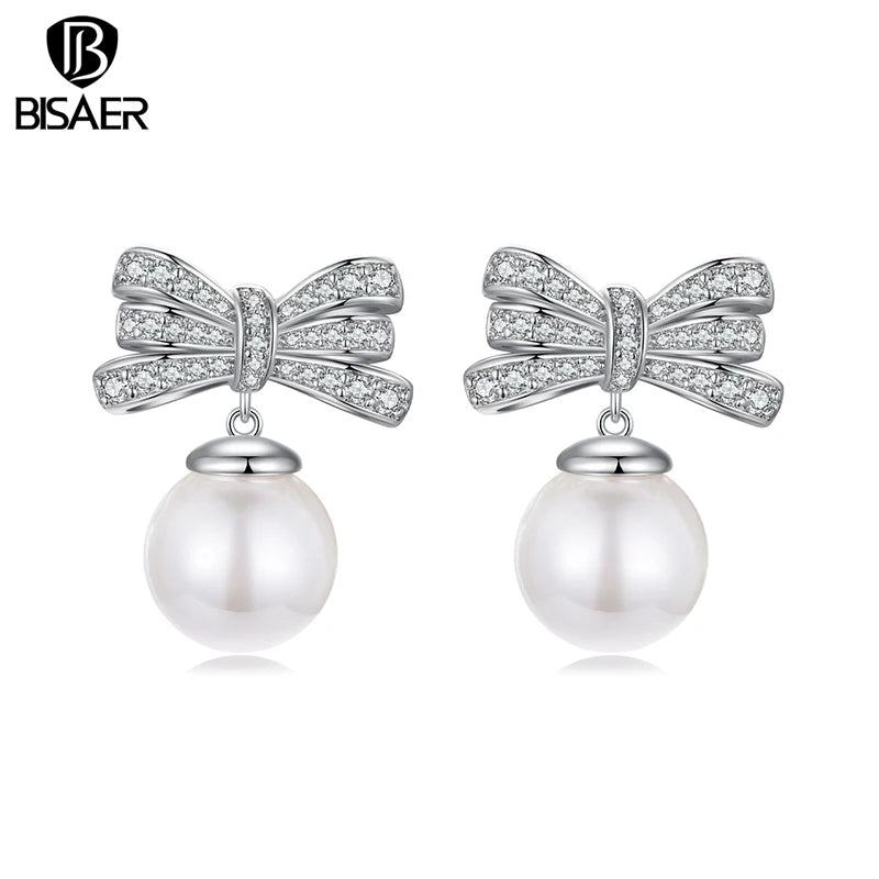 BISAER Boucles d'oreilles à tige en perles avec nœud papillon classique et élégantes, plaquées or blanc, pour femme, fête, fiançailles, bijoux tendance YIE247