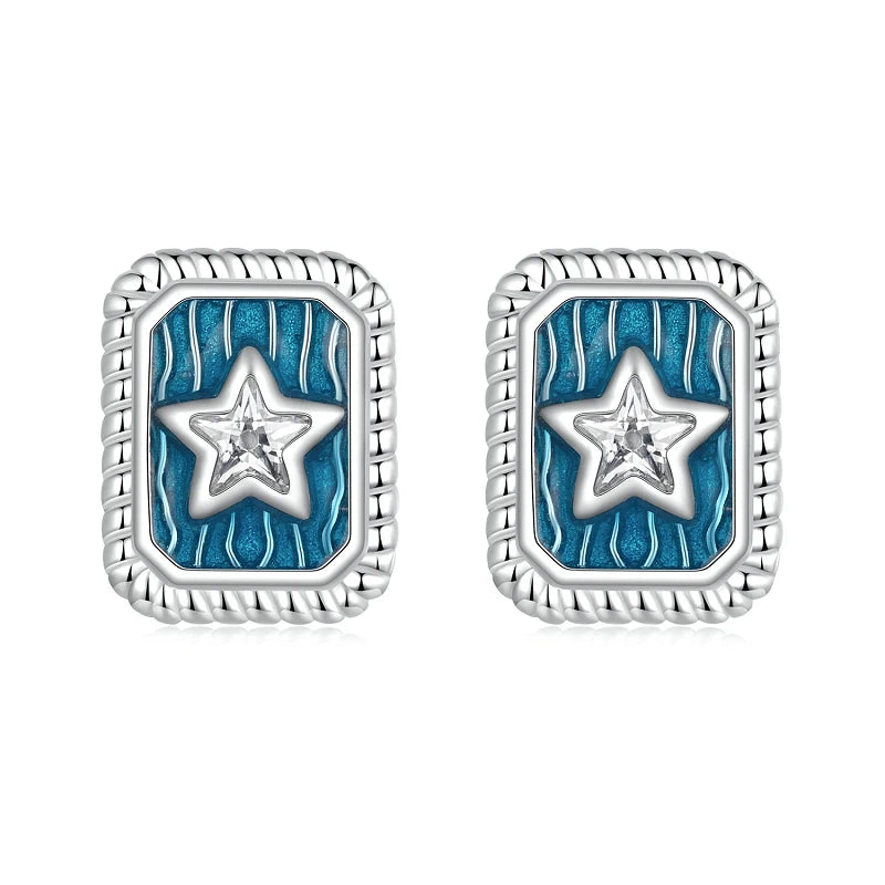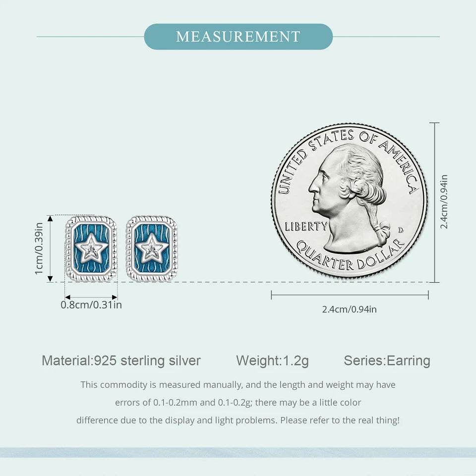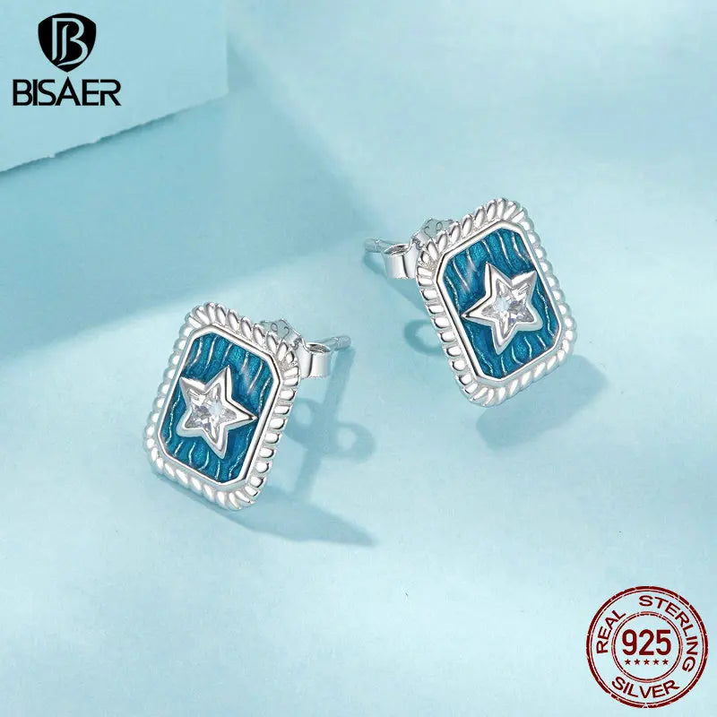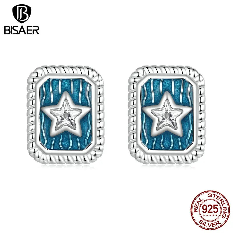 BISAER Boucles d'oreilles à tige en argent sterling 925 véritable style vintage en forme d'étoile, carrées et bleues, plaquées or blanc pour femme, bijoux fins de fête