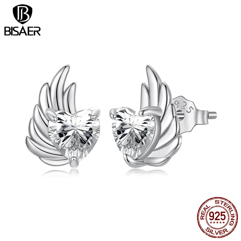 BISAER Real 925 Sterling Silver Wing Stud Earrings Heart Zircon Hypoallergenic Earrings for Women Party Weedding Fine Jewelry