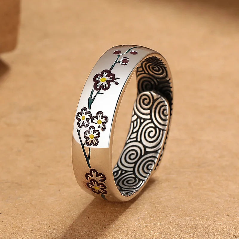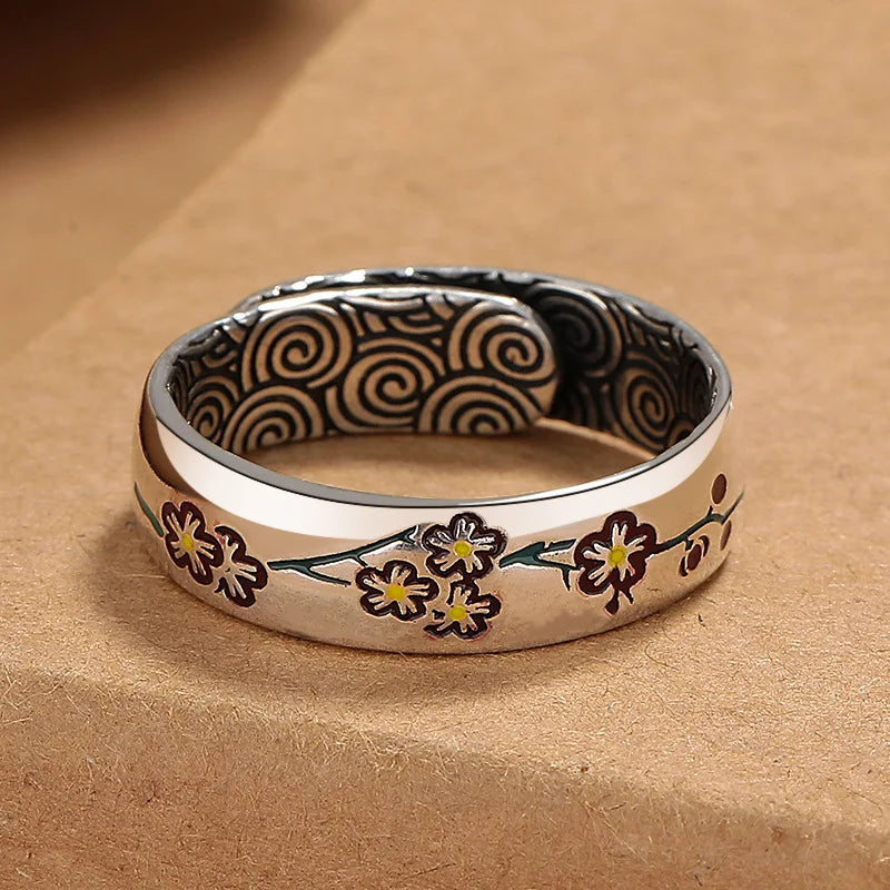 Bague ouverte en argent sterling 925 avec fleur de prunier pour femme et homme, bijou ethnique raffiné et tendance