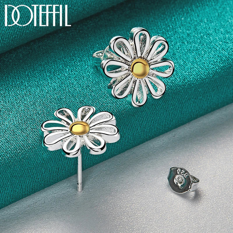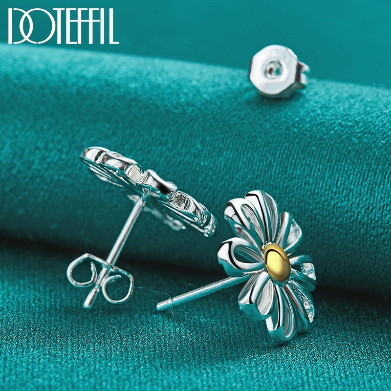 DOTEFFIL 925 Sterling Silver Golden flower Stud Earrings For Women Lady Gift Fashion Charm High Quality Wedding Jewelry