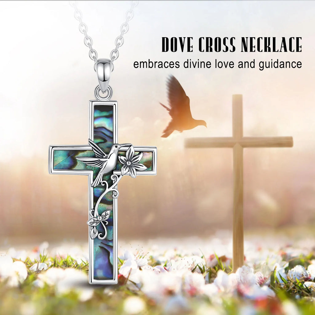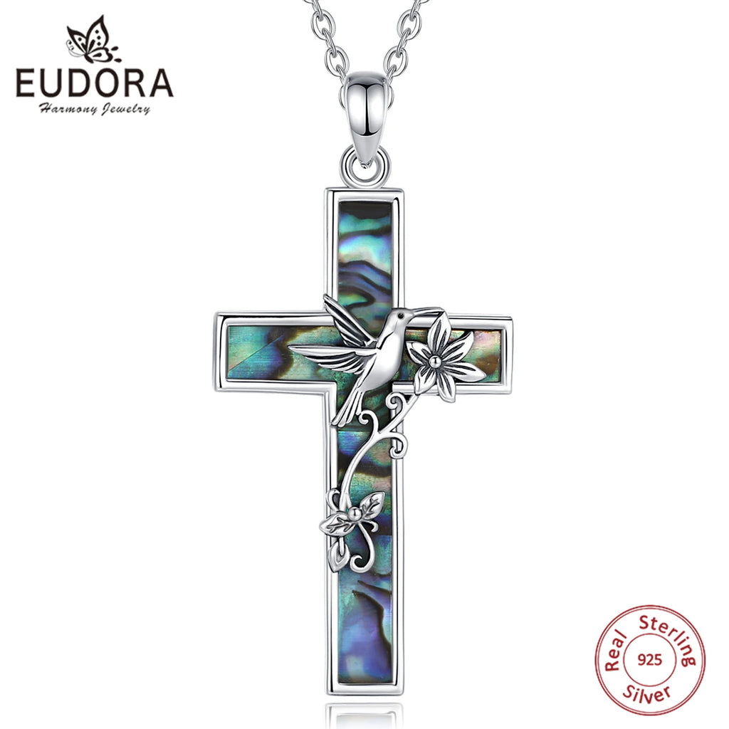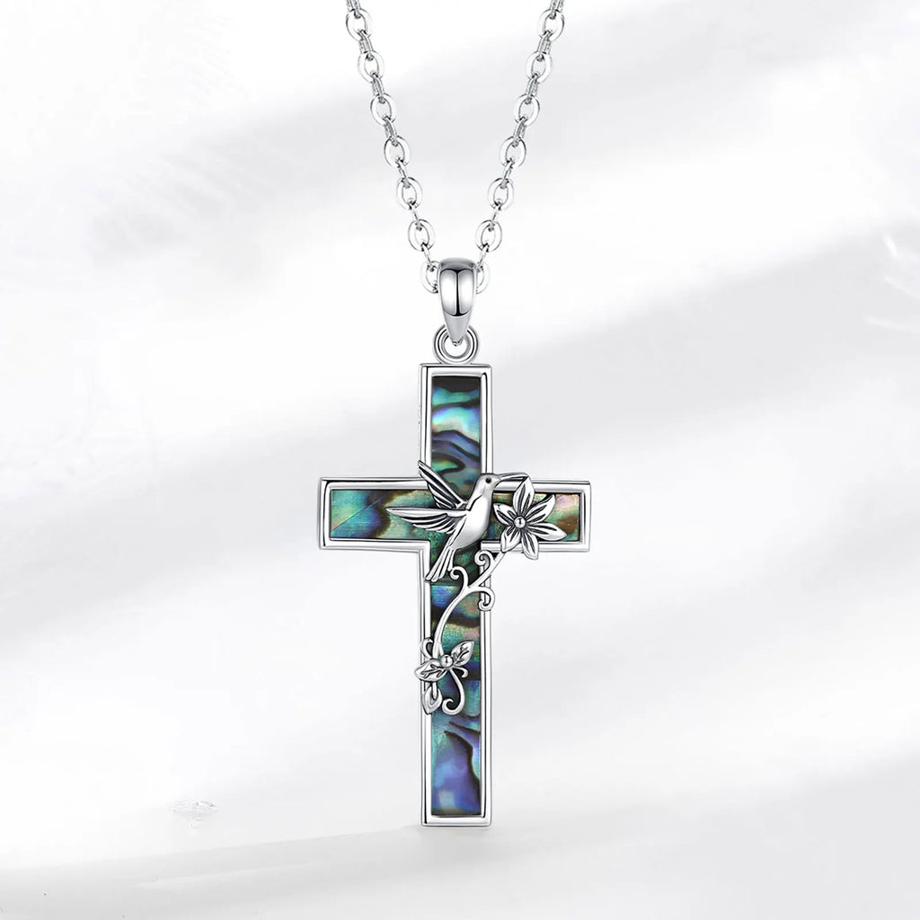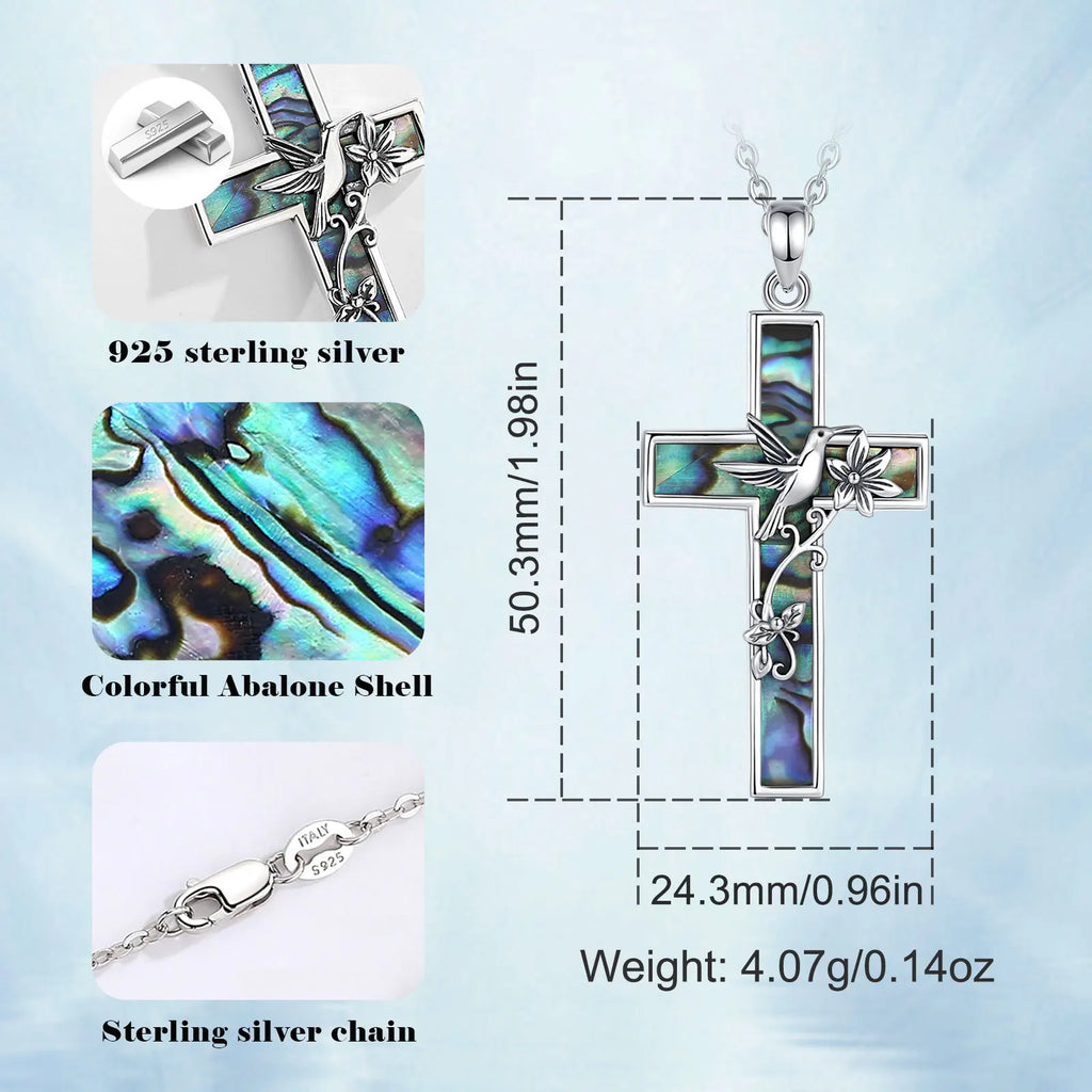 Collier croix colibri en argent sterling 925 Eudora pour femme et homme, pendentif en coquillage d'ormeau naturel, bijou religieux, cadeau raffiné