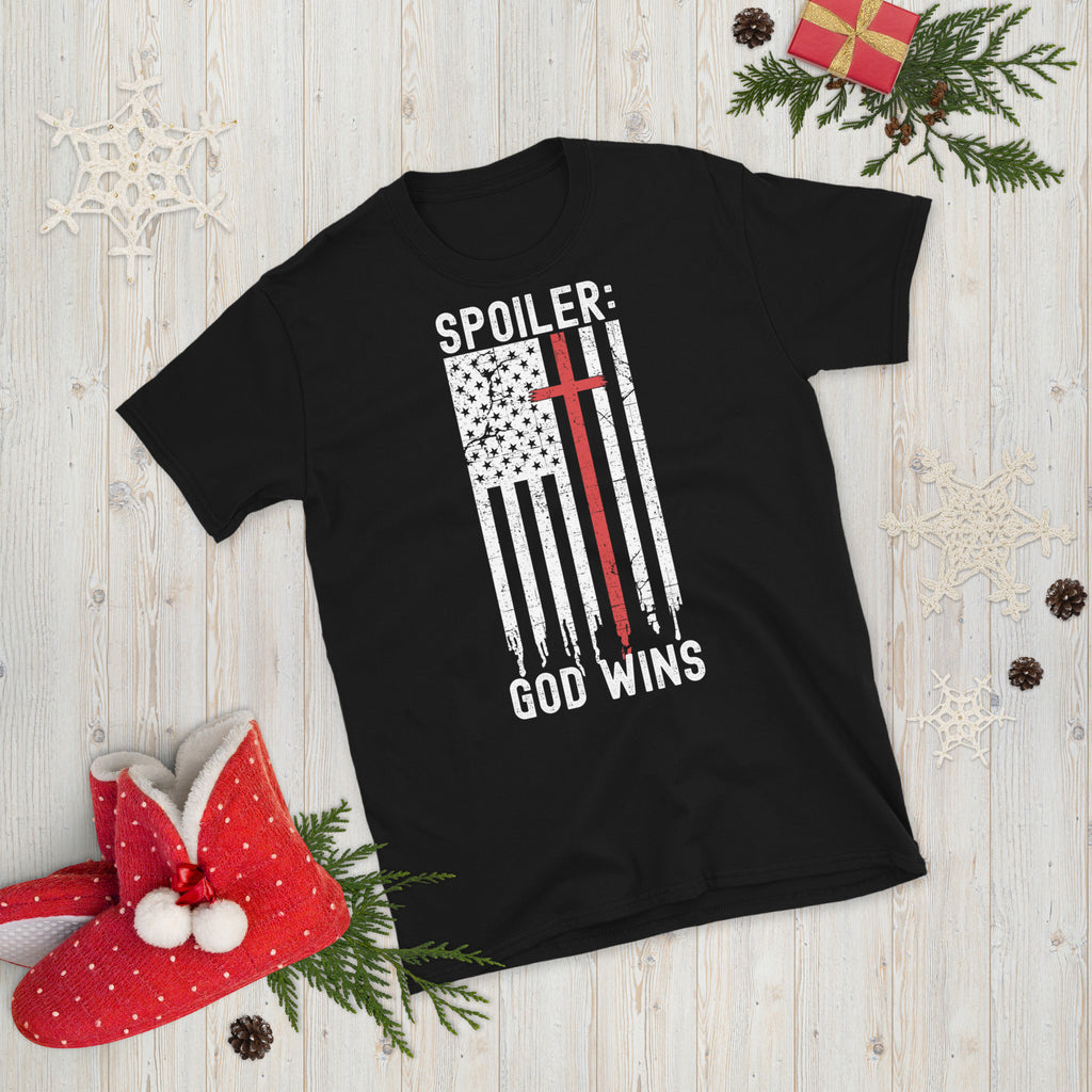 T-shirt chrétien drôle, Spoiler God Wins, T-shirt religieux, T-shirt Dieu patriote américain, T-shirt croix patriotique, T-shirt Dieu drôle, drapeau américain