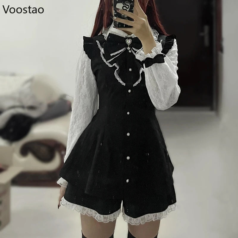 Robe mini style gothique japonais à strass et nœud papillon pour femme, style kawaii lolita, fausse robe deux pièces à manches longues et coupe cintrée.