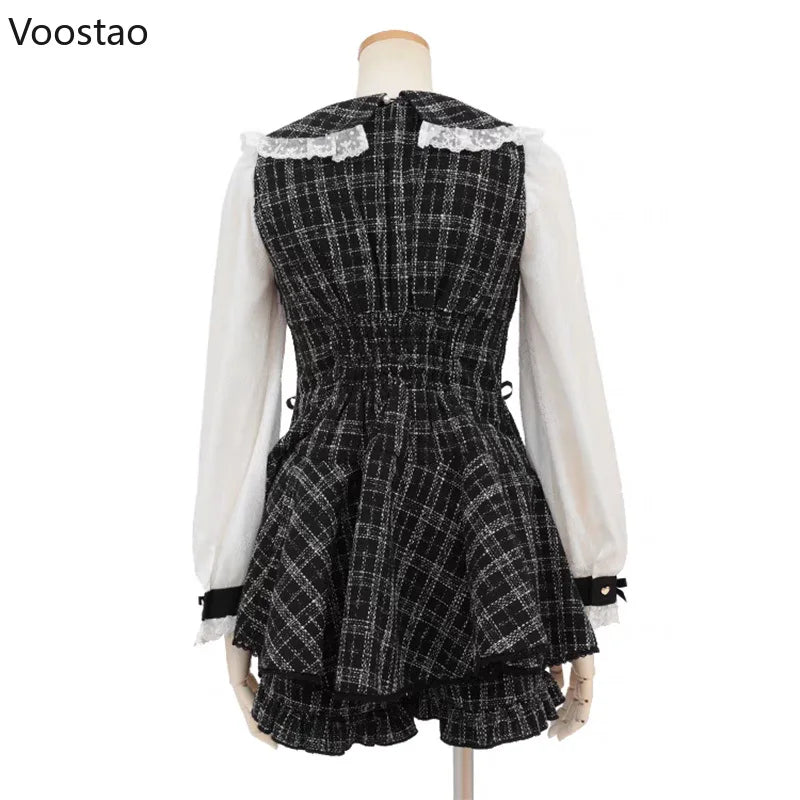 Ensemble robe-short et short style gothique japonais Y2K Lolita à nœud en strass, robe-chemise à volants en dentelle Harajuku, short à carreaux.