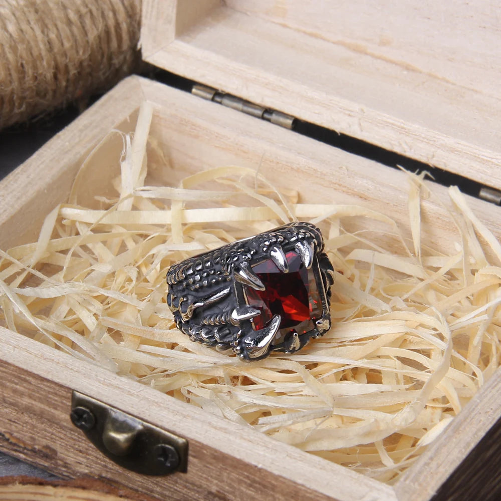 Bague en acier inoxydable avec pierre CZ rouge et anneau en forme de dragon punk sans décoloration, bijou d'alliance pour homme avec prière du Christ et boîte en bois